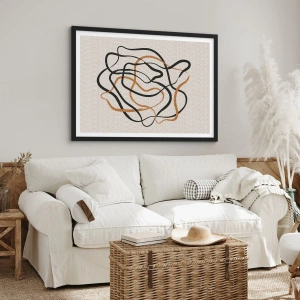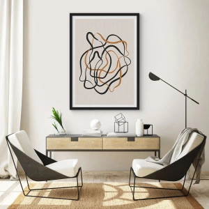 - Plakát představuje dynamickou kompozici propletených čar v černé a zlaté barvě na béžovém pozadí. Jeho minimalistický a umělecký design je ideální pro moderní interiéry. Je vyroben z vysoce kvalitních materiálů a zarámován do černého rámu.