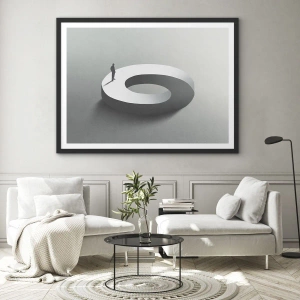 - Plakát zobrazuje osamělou postavu stojící na abstraktní geometrické struktuře. Jeho minimalistický tvar a monochromatické barvy mu dodávají moderní a zajímavý charakter. Je vyroben z vysoce kvalitních materiálů a zarámován do černého rámu.