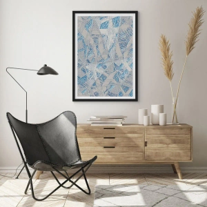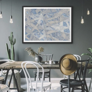 „V modrošedém bludišti“ je moderní plakát, který potěší svou precizně komponovanou geometrickou abstrakcí. Kompozice založená na dynamických tvarech a kontrastních texturách v odstínech modré a šedé vytváří vizuálně poutavý povrch plný harmonie a hloubky.