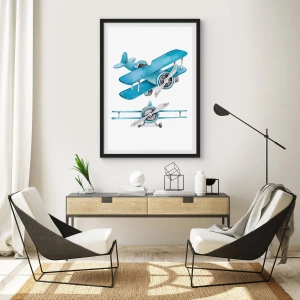 Plakát v černém rámu - Akvarelové modré dvojplošníky - 50x70cm - Rozený vítěz - Moderní nástěnná dekorace do obývacího pokoje a ložnice ARTTOR