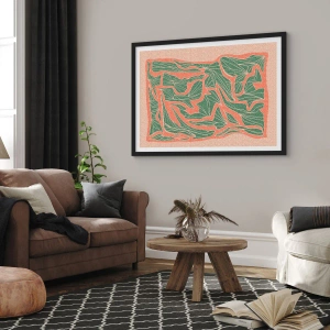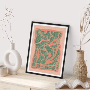 Plakát v černém rámu - Abstraktní listový vzor v odstínech zelené a terakoty - 50x70cm - Souboj korálů a zeleně - Moderní nástěnná dekorace do obývacího pokoje a ložnice ARTTOR