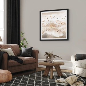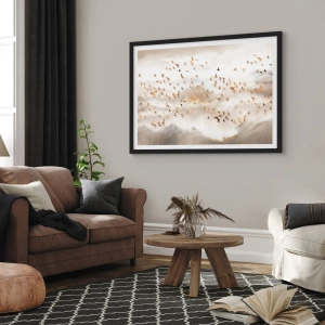 Plakát v černém rámu - Hejno ptáků plující mezi mlhavými mraky - 50x70cm - Je čas… - Moderní nástěnná dekorace do obývacího pokoje a ložnice ARTTOR