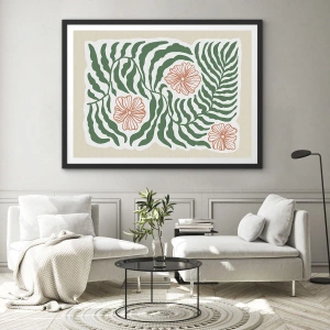 Plakát v černém rámu - Abstraktní grafika listů a květů na béžovém pozadí - 50x70cm - Rozkvetlé v zeleni - Moderní nástěnná dekorace do obývacího pokoje a ložnice ARTTOR