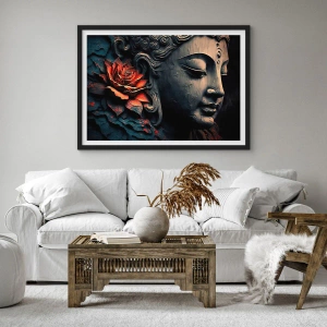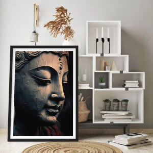 Plakát v černém rámu - Detail sochy Buddhy v teplém světle - 50x70cm - V souladu se světem - Moderní nástěnná dekorace do obývacího pokoje a ložnice ARTTOR