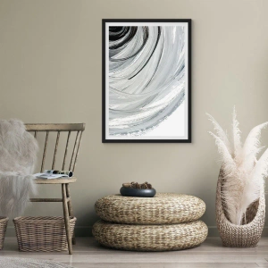 - Plakát představuje dynamickou abstrakci v odstínech černé, bílé a šedé. Vířící tahy štětcem vytvářejí pohyb a hloubku, což kompozici dodává moderní a elegantní nádech.