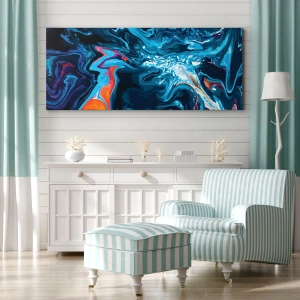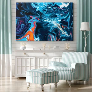 - Moderní obraz s dynamickým abstraktním vzorem v odstínech modré s kontrastními oranžovými akcenty. Ideální do energických interiérů.