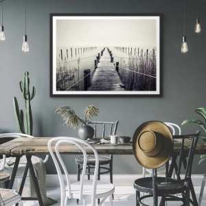 - Plakát zobrazuje dřevěné molo vedoucí do mlhavé vodní plochy. Jeho minimalistická estetika a jemné barvy vytvářejí atmosféru klidu a zamyšlení.