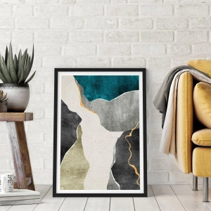 Plakát v černém rámu - Abstraktní kompozice s geometrickými tvary - 50x70cm - Mozaiková kompozice se zlatou nití - Moderní nástěnná dekorace do obývacího pokoje a ložnice ARTTOR