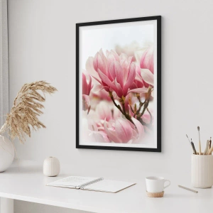 Jarní květiny je plakát, který zachycuje mimořádnou krásu jarní přírody. Zobrazuje rozkvetlé květy magnólie, jejichž jemné okvětní lístky se zdají vznášet v měkkém světle, což zdůrazňuje jejich jemnost a přirozenou eleganci.
