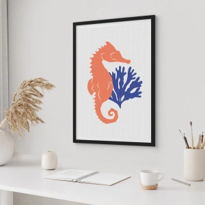 Plakát v černém rámu - Minimalistická grafika mořského koníka a korálů - 50x70cm - Na podvodní louce - Moderní nástěnná dekorace do obývacího pokoje a ložnice ARTTOR