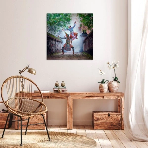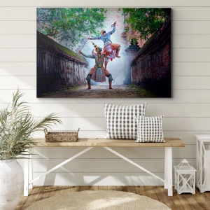 • Dynamický obraz zobrazující tradiční tanec v historickém prostředí, obklopený zdmi a stromy. Tento jedinečný kulturní motiv je ideální pro interiéry hledající exotickou a uměleckou inspiraci.