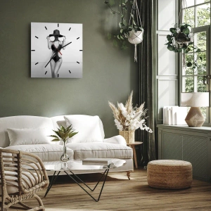 - Stylizovaný portrét ženy v černých plavkách a klobouku na pozadí klidného moře. Tyto kulaté skleněné hodiny měří 30x30 cm. Ideální do moderního a smyslného interiéru.