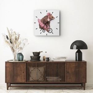 Nástěnné hodiny - Medvěd v růžové sukni jedoucí na jednokolce - 30x30cm - To je ale cirkus! - Moderní nástěnná dekorace do obývacího pokoje, kuchyně a ložnice ARTTOR