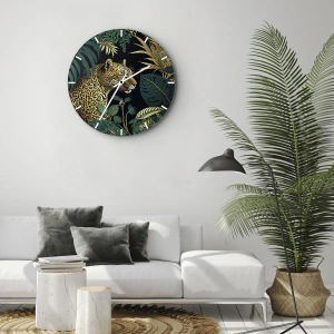 Nástěnné hodiny - Hostitel v džungli - Leopard mezi tropickými listy na černém pozadí