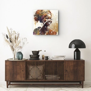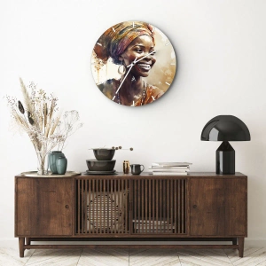 Nástěnné hodiny „Africká královna“ vyzařují radost, sílu a krásu. Zobrazují usmívající se ženu v barevném turbanu, vyobrazenou stylem připomínajícím akvarelovou malbu. Kompozice se zaměřuje na výraz portrétu – plný štěstí a přirozeného projevu – a vytváří tak dojemnou scénu, která přitahuje pozornost a inspiruje.
