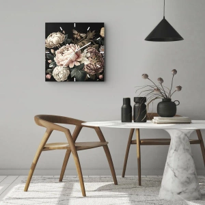 Nástěnné hodiny „V barokním stylu“ představují sofistikovanou a romantickou kompozici v klasickém stylu. Na tmavém pozadí je zobrazena bohatá kytice pivoňek v odstínech růžové, krémové a béžové s doplněním tmavě zelených listů. Nad nimi se vznáší jemný motýl, který dodává scéně lehkost a pohyb.