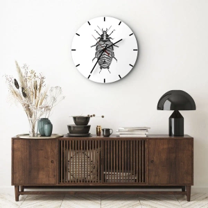 Nástěnné hodiny What a Specimen! jsou výraznou a originální grafickou kompozicí, která představuje detailní ilustraci hmyzu. Jejich ciferník zdobí kresba ve stylu klasické rytiny, zobrazující symetrické detaily krunýře a nohou. Na čistě bílém pozadí se černá grafika stává výrazným a poutavým dekorativním prvkem.