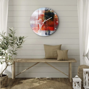 Nástěnné hodiny „Zářící kompozice“ jsou výrazným dekorativním akcentem, který vyzařuje energii a umělecký výraz. Ciferník hodin představuje abstraktní, geometrické tvary v intenzivních odstínech červené, přecházejících přes oranžovou, černou a kontrastní šedou. Kompozice připomíná vrstvené aranžmá, ve kterých hraje hlavní roli barva, a vytváří tak efekt zářícího prostoru.