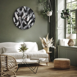 Model má kulatý tvar o rozměrech 30x30 cm a je vyroben ze skleněného povrchu, který kompozici dodává elegantní lesk a zdůrazňuje kontrast černé a bílé. Skleněný panel chrání grafiku a nástěnné hodiny vypadají moderně a profesionálně, přitahují pozornost a obohacují interiér.