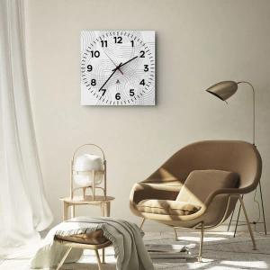 Hodiny jsou vyrobeny z bezpečného tvrzeného skla o tloušťce 4mm. Technologie výroby hodin je v souladu s třídou bezpečnosti 2B2 podle normy PN-EN 12600:2004, která garantuje odolnost proti nárazům. Hodiny na skle jsou připravené k zavěšení – mají kovový závěs upevněný na zadní částí hodin a pěnovou distanční podložku, která upravuje vzdálenost hodin od zdi. Hodiny mají tichý plovoucí mechanismus napájený 1,5V baterií - AA baterie (baterie není součástí balení).