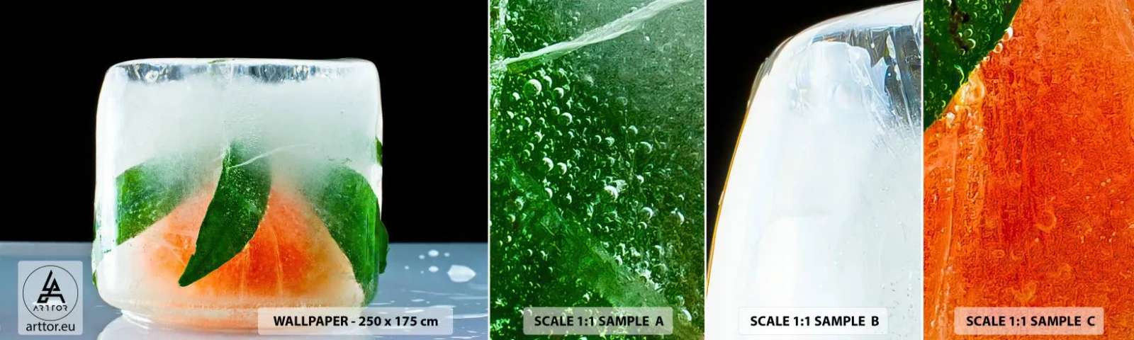 Fototapeta Vzorek Standard Eco - Svěžest a osvěžení - Kostka ledu, oranžový, List máty - 100x30 cm