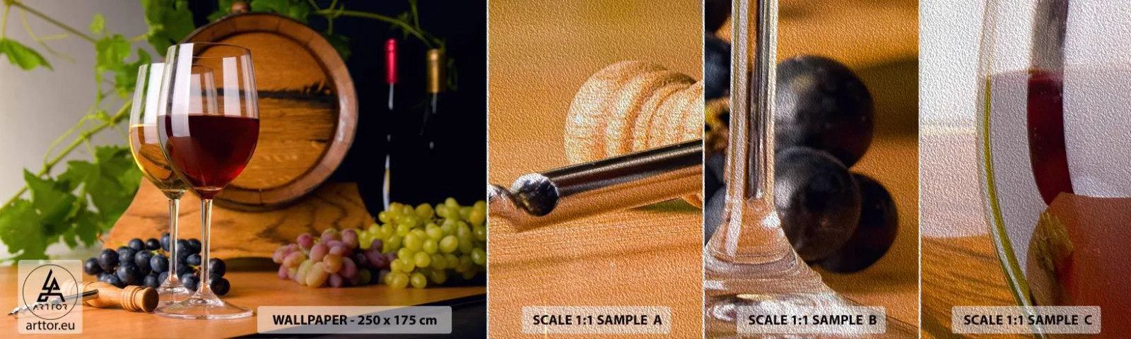 Vzor Fototapety Premium Sand - Jako u starých mistrů - Vinný sud, Hroznová, Sklenice vína - 100x30 cm