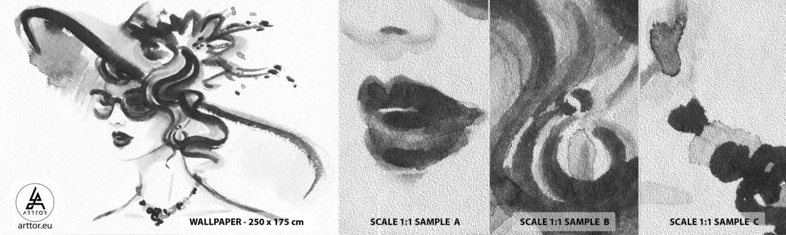 Vzor Fototapety Premium Sand - Dáma s charakterem - žena V Klobouku, ženská tvář, Černý a bílý - 100x30 cm
