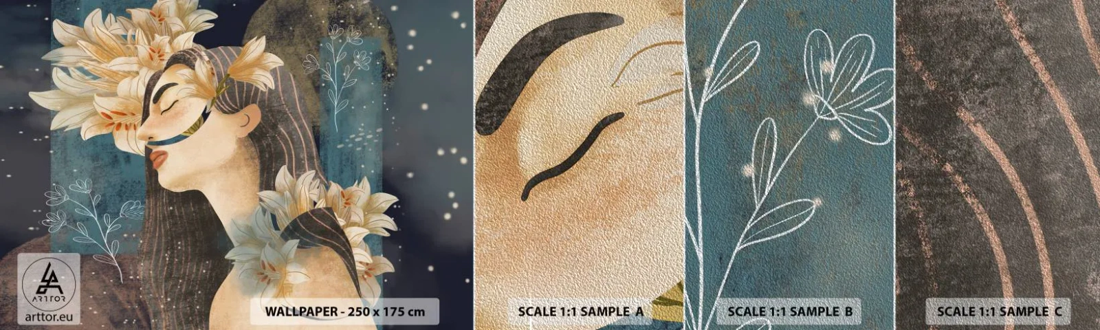 Vzor Fototapety Premium Sand - Pohádka o princezně s liliemi - Abstrakce, Žena, Květiny - 100x30 cm
