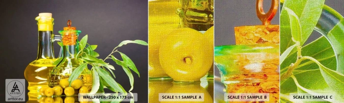 Vzor Fototapety Premium Canvas - Zátiší s olivami a olejem - Gastronomie, Olivy, Olej - 100x30 cm
