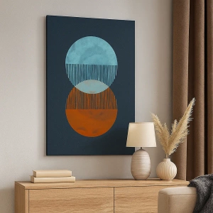 - Obraz zobrazuje dva oranžové a modré kruhy na tmavém pozadí. Minimalistická a umělecká kompozice, ideální pro moderní interiéry, s důrazem na kontrast a harmonii.