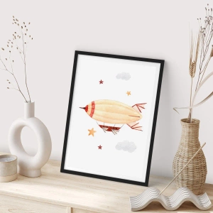 Tento unikátní zarámovaný plakát zobrazuje akvarelovou vzducholoď vznášející se mezi mraky a hvězdami. Jemné barvy a decentní detaily z něj činí perfektní dekoraci do dětského pokoje nebo interiéru ve vintage stylu. Teplé pastelové odstíny dodávají kompozici lehkost a vytvářejí atmosféru snů a cestování.
