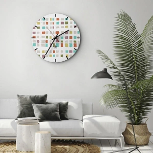 Nástěnné hodiny - Neznámá hra - Barevné čtverce na bílém pozadí v abstraktním stylu