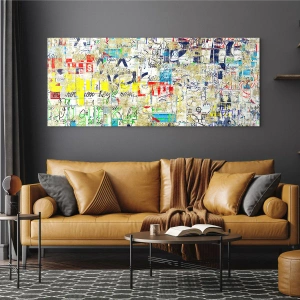 • Skleněný obraz s abstraktní kompozicí plnou barev a textu. Ideální pro moderní interiéry, které si cení kreativního umění.