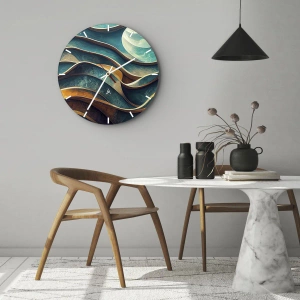 - Nástěnné hodiny s abstraktním vlnovým motivem v odstínech modré a hnědé. Vzor vytváří trojrozměrný efekt hloubky a obohacuje prostor o umělecký výraz a eleganci.