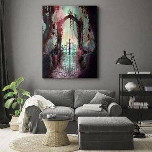 - Tento plátěný obraz o rozměrech 70x50 cm zobrazuje magický vchod s kovanou železnou bránou obklopenou bujnou, barevnou vegetací. Unikátní dekorace, která vytváří tajemnou a fantastickou atmosféru.