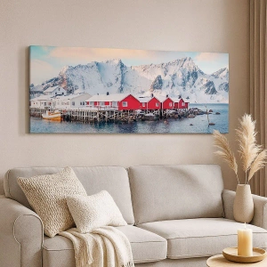 Nástěnný obraz - Severní útočiště - Červené chatky na pozadí zasněžených hor a modrého moře