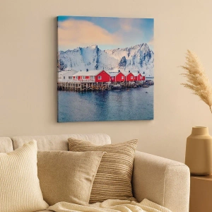 - Tento obraz zobrazuje červené chatky na pozadí zasněžených hor a modrého moře. Ideální do interiérů inspirovaných přírodou a klidem. Plátno má rozměr 70x50 cm.