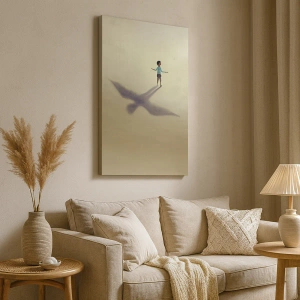 - Tento obraz zobrazuje dítě se stínem ptáka na pozadí v teplých tónech. Ideální do interiérů inspirovaných symbolikou a klidem. Tisk na plátně má rozměr 70x50 cm.