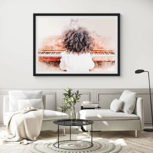 Plakát v černém rámu - Dítě s bujnými kadeřemi hrající na klavír ve stylu akvarelu - 50x70cm - V novém světě - Moderní nástěnná dekorace do obývacího pokoje a ložnice ARTTOR