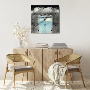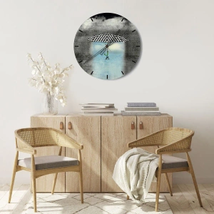 Obohaťte svůj interiér uměleckým nádechem s těmito hodinami. Černobílý kostkovaný deštník na pozadí dešťových mraků a modré oblohy je dekorací, která dodá vašemu domovu jedinečný styl.
