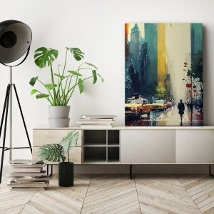 - Tento akvarel zobrazuje dynamickou městskou scénu s taxíky, chodci a barevnými budovami. Do každého interiéru vnáší energii a moderní styl. Je to perfektní dekorativní prvek pro milovníky městské krajiny.