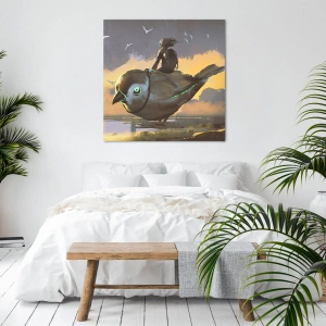 Nástěnný obraz - Zastávka na fantastické cestě - Jezdec na obřím ptákovi v surrealistické krajině