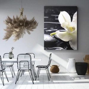 Bílá orchidej na pozadí černých kamenů a vody je perfektní dekorativní volbou pro moderní a elegantní interiéry. Tento obraz na plátně vytváří atmosféru klidu a harmonie a dodává každé místnosti nádech jedinečného stylu a noblesy.