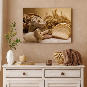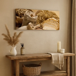 Obraz "Rustikální kompozice s chlebem a klasy" je nástěnná dekorace, která evokuje atmosféru venkovského klidu a tradic. Zobrazuje přírodní kompozici s chlebem, moukou v lněných pytlích a klasy, zdůrazňující kouzlo jednoduchých radostí a blízkost přírody.
