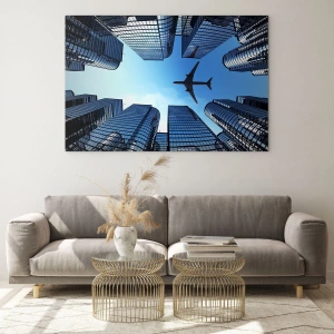 - Tento skleněný obraz zobrazuje pohled na letadlo letící nad moderními mrakodrapy. Ideální do interiérů s moderním a minimalistickým stylem.