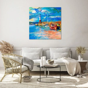 - Obraz zobrazuje duhově zbarvený záliv s majákem a barevnými loděmi. Atmosférická krajina, ideální do obývacího pokoje nebo kanceláře.