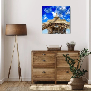 Nástěnné hodiny „Sahající po obloze a oblacích“ jsou jedinečnou poctou jednomu z nejznámějších symbolů francouzské a světové architektury. Ciferník zobrazuje Eiffelovu věž zachycenou zdola, což vám umožní ocenit majestátnost a řemeslné zpracování tohoto železného zázraku. Pozadí modré oblohy s jemnými obláčky dodává celku pocit lehkosti a prostoru a zdůrazňuje jeho jedinečný charakter.