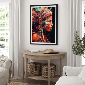 - Plakát zobrazuje výrazný portrét ženy s barevnou tradiční peříčkovou pokrývkou hlavy. Bohaté barvy a detailní dekorativní prvky zdůrazňují mystickou a symbolickou povahu obrazu, což je ideální pro interiéry inspirované uměním a kulturou.