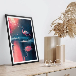 Plakát v černém rámu - Plameňáci na klidném jezeře - 50x70cm - Ptačí útočiště - Moderní nástěnná dekorace do obývacího pokoje a ložnice ARTTOR