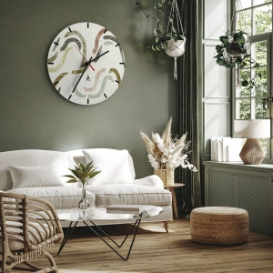 Nástěnné hodiny Radostný tanec abstrakce jsou elegantní nabídkou pro milovníky přírodních zemitých barev a jednoduchých, uměleckých forem. Jejich ciferník znázorňuje abstraktní kompozici skládající se z organických linií v odstínech zelené, rezavé a béžové. Celek je zasazen do světlého pozadí s jemnou texturou, což designu dodává prostornost a decentní výraz.